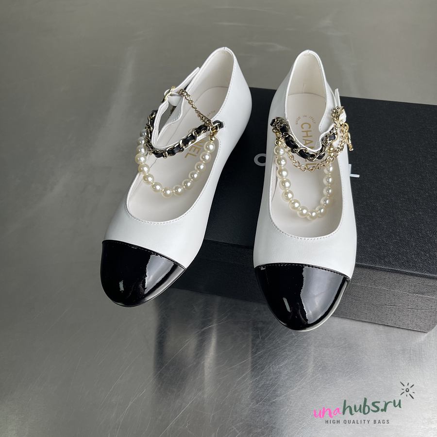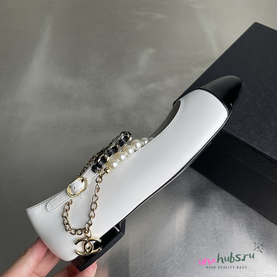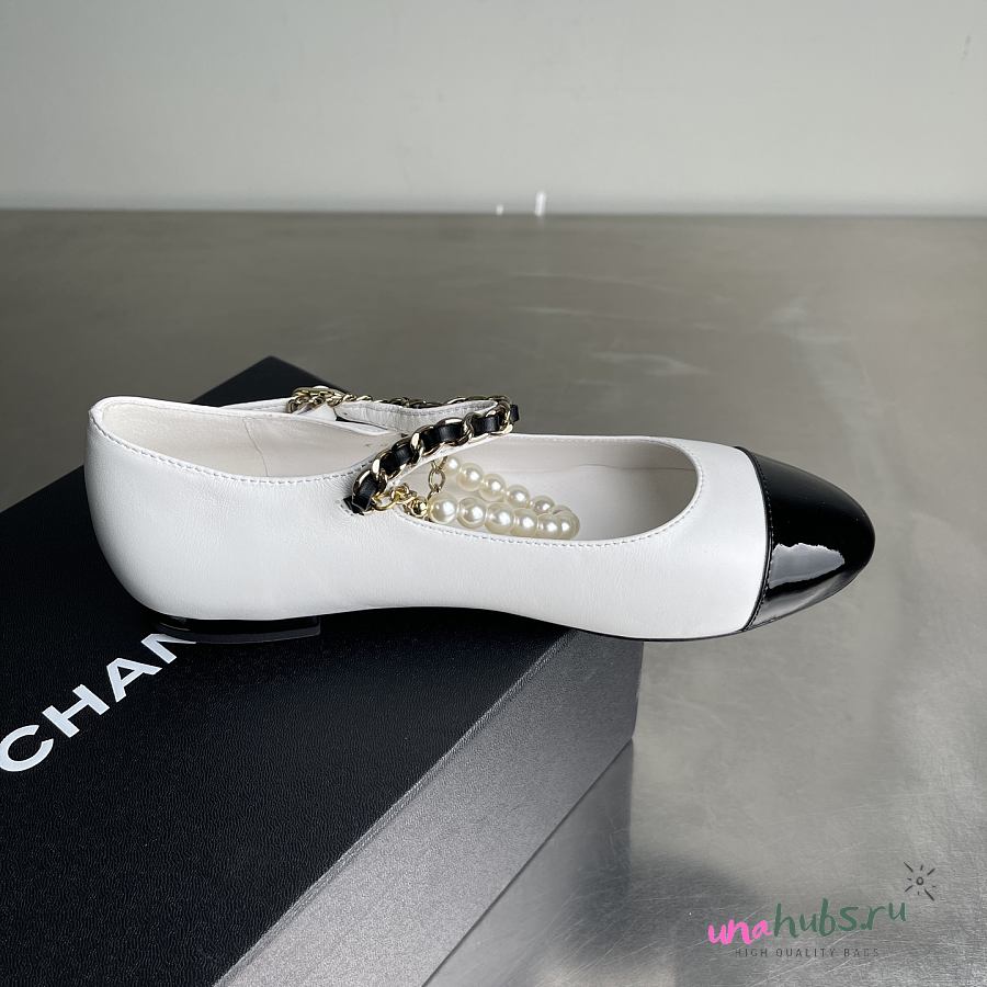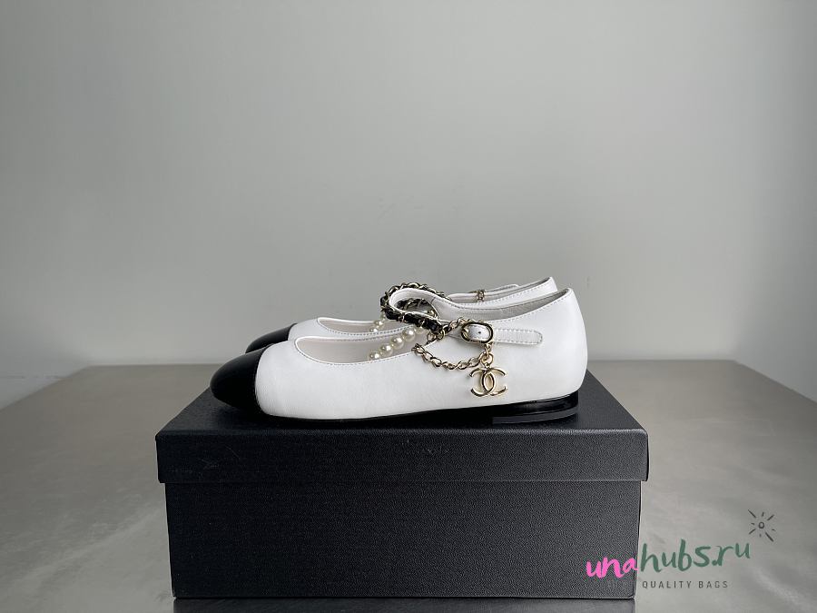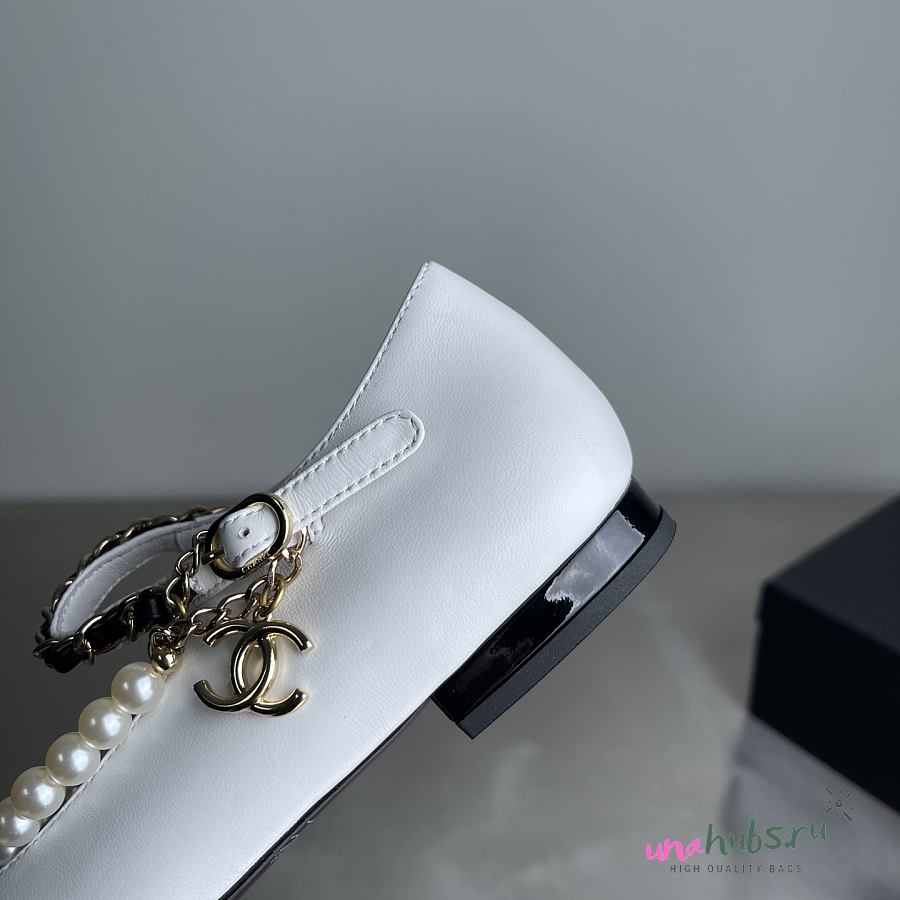 CHANEL Shiny Lambskin Pearl Cap Toe Ankle Chain Ballerina Flats White