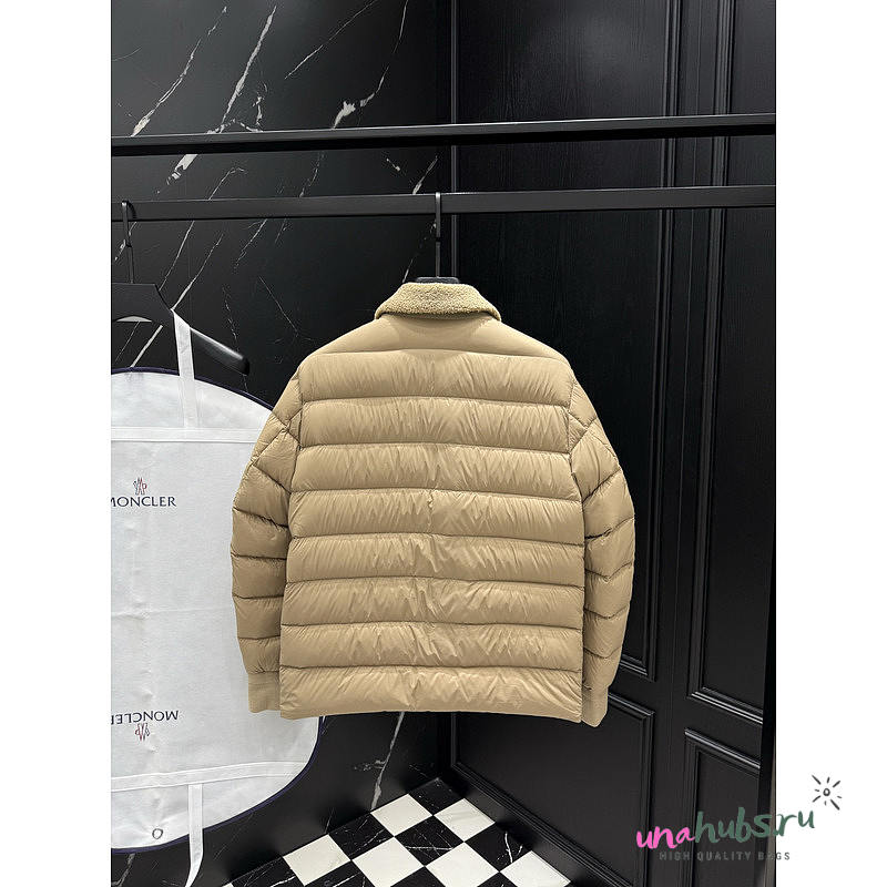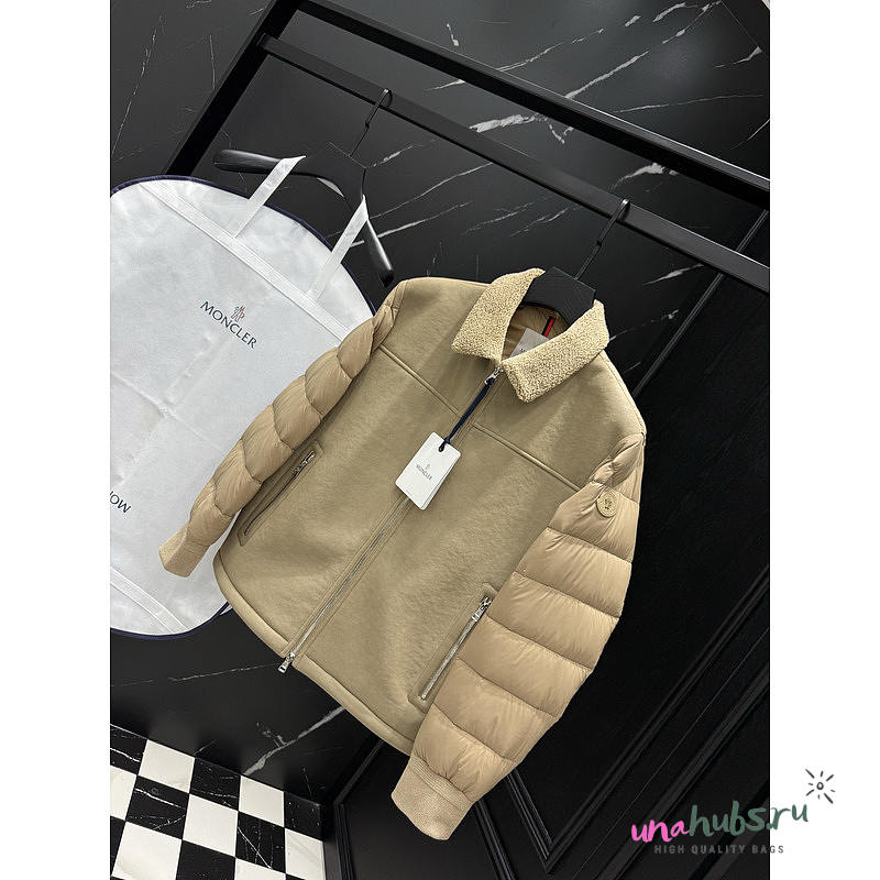 Moncler Leather Hybrid Down Jacket with Shearling Collar In Light Brown